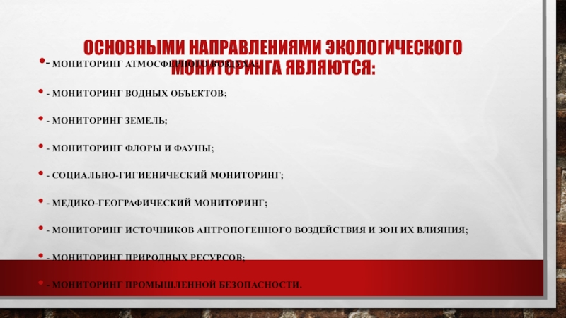 Слайд 9Основными направлениями экологического мониторинга являются:
