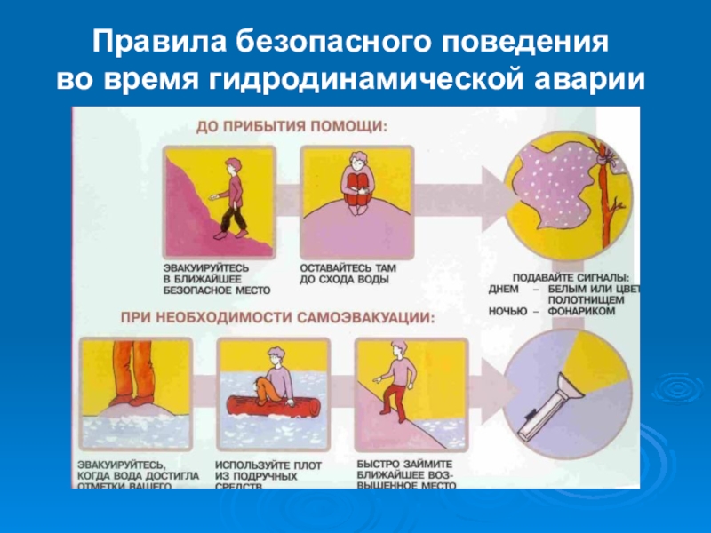 спасения от удара волны прорыва срочно займите ближайшее возвышенное место или верхний этаж устойчивого здания. В случае нахождения в воде, при приближении волны прорыва нырните в глубину у основания волны.
