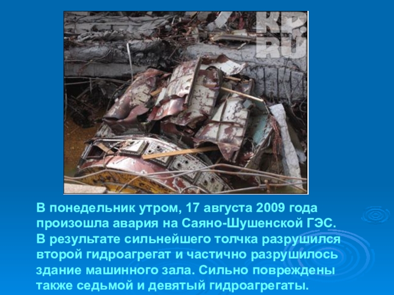 Слайд 39В понедельник утром, 17 августа 2009 года произошла авария на Саяно-Шушенской