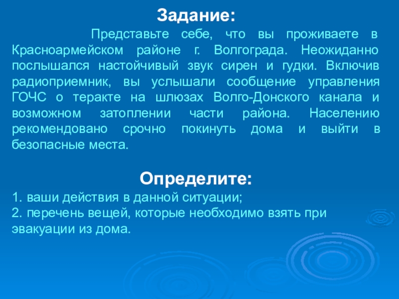 районе г. Волгограда. Неожиданно послышался настойчивый звук сирен и гудки. Включив радиоприемник, вы услышали сообщение управления ГОЧС о теракте на шлюзах Волго-Донского канала и возможном затоплении части района. Населению рекомендовано срочно покинуть дома и выйти в безопасные места.