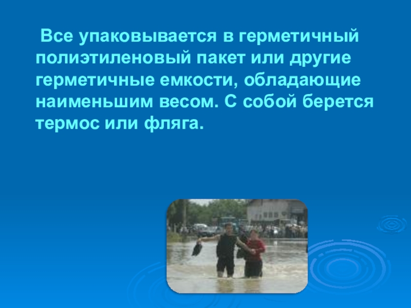 по воде, возьмите документы, предметы первой необходимости, одежду и обувь с водоотталкивающими свойствами, подручные спасательные средства (надувные матрасы, подушки).