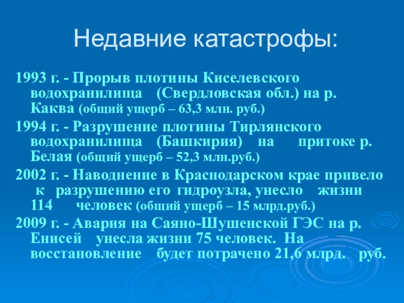 2002 г. - Наводнение в Краснодарском крае привело к разрушению его гидроузла, унесло жизни 114 человек (общий ущерб – 15 млрд.руб.)
