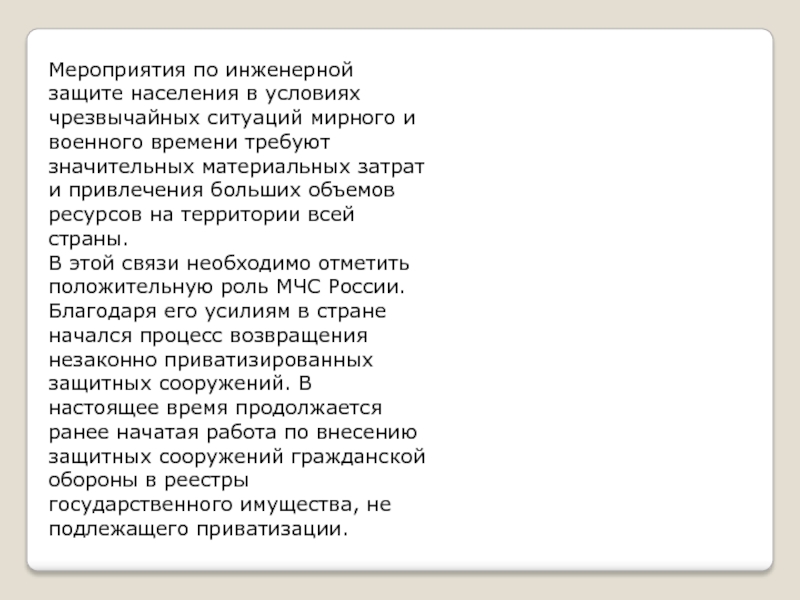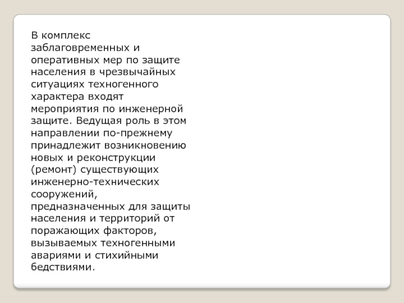 Слайд 40Мероприятия по инженерной защите населения в условиях чрезвычайных ситуаций мирного и