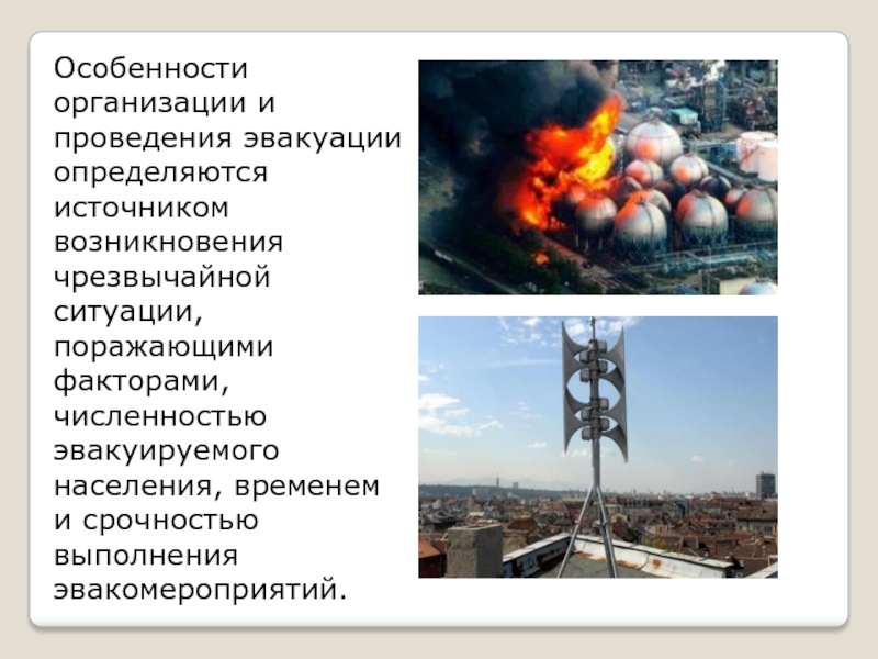 Слайд 21Особенности организации и проведения эвакуации определяются источником возникновения чрезвычайной ситуации, поражающими