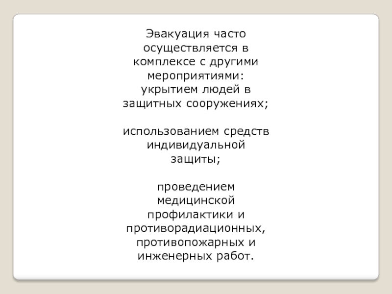 Слайд 20Эвакуация часто осуществляется в комплексе с другими мероприятиями: