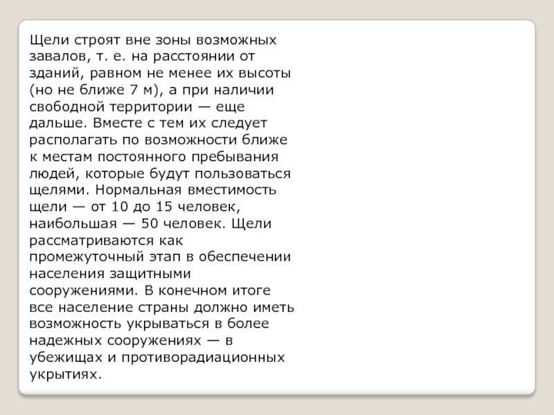 зданий, равном не менее их высоты (но не ближе 7 м), а при наличии свободной территории — еще дальше. Вместе с тем их следует располагать по возможности ближе к местам постоянного пребывания людей, которые будут пользоваться щелями. Нормальная вместимость щели — от 10 до 15 человек, наибольшая — 50 человек. Щели рассматриваются как промежуточный этап в обеспечении населения защитными сооружениями. В конечном итоге все население страны должно иметь возможность укрываться в более надежных сооружениях — в убежищах и противорадиационных укрытиях.