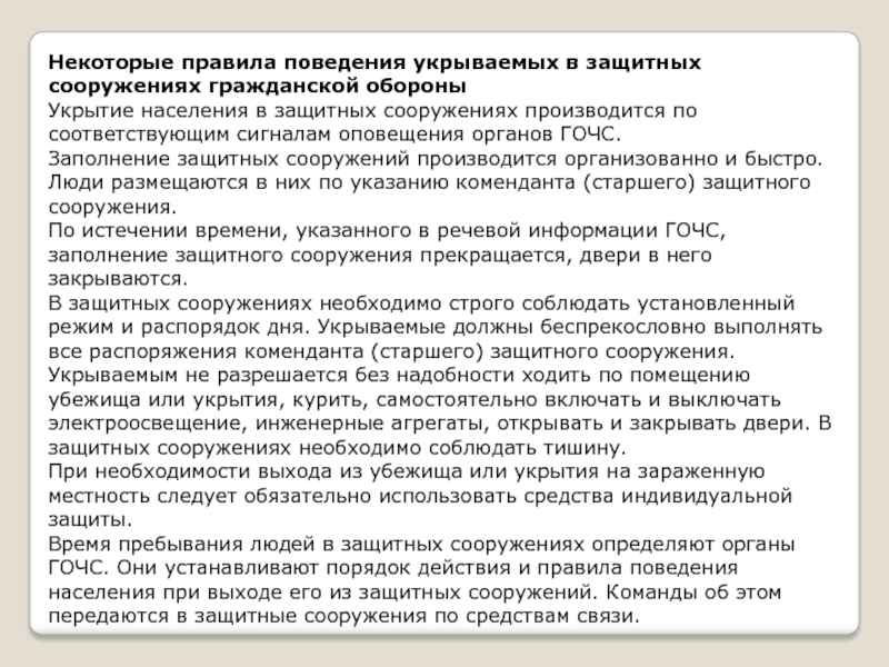 Слайд 43Некоторые правила поведения укрываемых в защитных сооружениях гражданской обороны