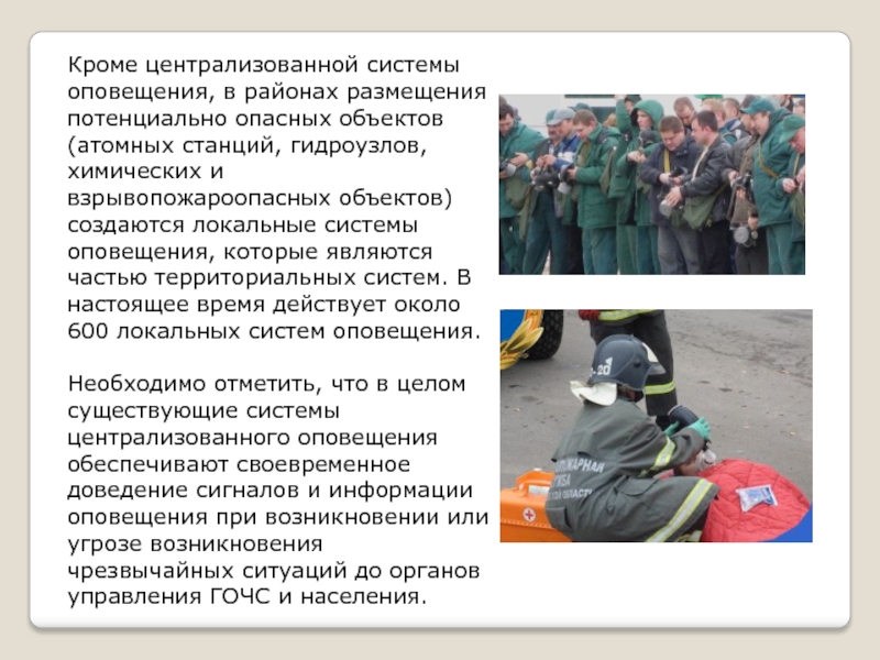 станций, гидроузлов, химических и взрывопожароопасных объектов) создаются локальные системы оповещения, которые являются частью территориальных систем. В настоящее время действует около 600 локальных систем оповещения.