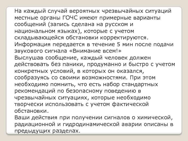 варианты сообщений (запись сделана на русском и национальном языках), которые с учетом складывающейся обстановки корректируются. Информация передается в течение 5 мин после подачи звукового сигнала «Внимание всем!»