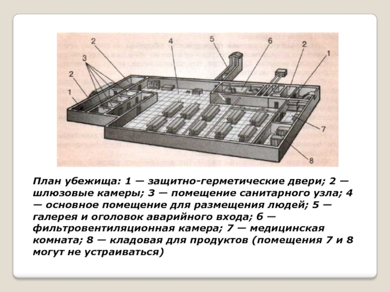 Слайд 37План убежища: 1 — защитно-герметические двери; 2 — шлюзовые камеры; 3