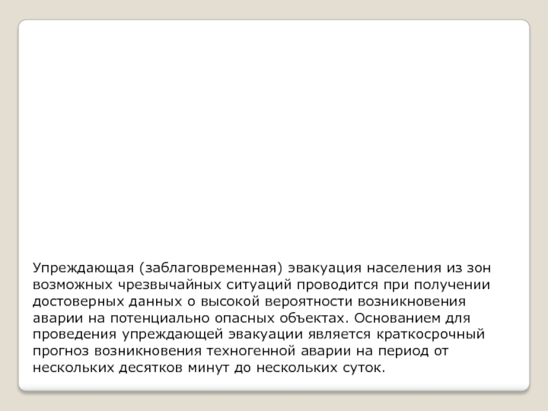 Слайд 28Упреждающая (заблаговременная) эвакуация населения из зон возможных чрезвычайных ситуаций проводится при