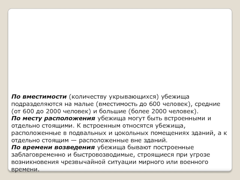 Слайд 36По вместимости (количеству укрывающихся) убежища подразделяются на малые (вместимость до 600 человек),
