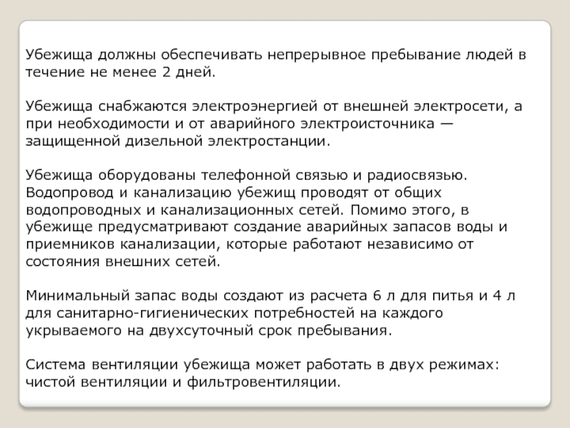 Слайд 38Убежища должны обеспечивать непрерывное пребывание людей в течение не менее 2