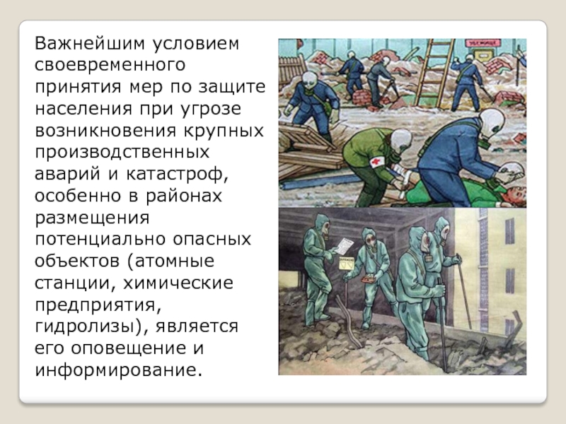 крупных производственных аварий и катастроф, особенно в районах размещения потенциально опасных объектов (атомные станции, химические предприятия, гидролизы), является его оповещение и информирование.