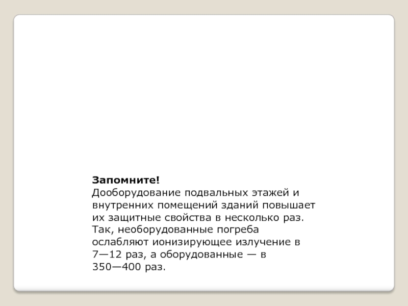 в несколько раз. Так, необорудованные погреба ослабляют ионизирующее излучение в 7—12 раз, а оборудованные — в 350—400 раз.