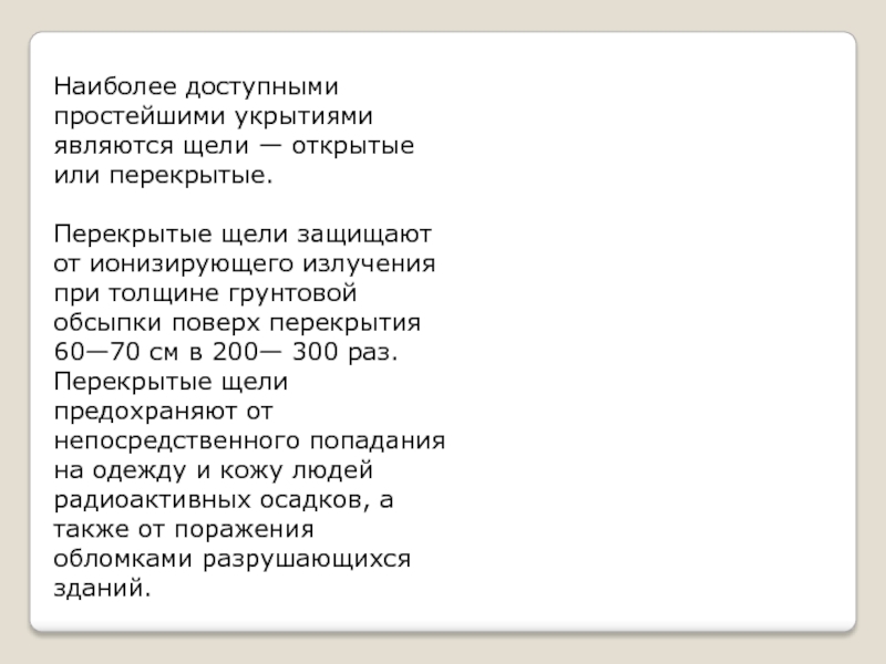 защищают от ионизирующего излучения при толщине грунтовой обсыпки поверх перекрытия 60—70 см в 200— 300 раз. Перекрытые щели предохраняют от непосредственного попадания на одежду и кожу людей радиоактивных осадков, а также от поражения обломками разрушающихся зданий.