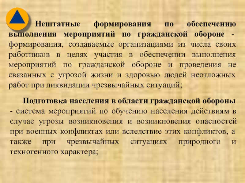 Нештатные формирования по обеспечению выполнения мероприятий по гражданской обороне - формирования, создаваемые организациями из числа своих работников в целях участия в обеспечении выполнения мероприятий по гражданской обороне и проведения не связанных с угрозой жизни и здоровью людей неотложных работ при ликвидации чрезвычайных ситуаций;