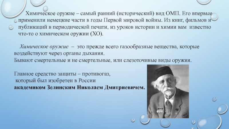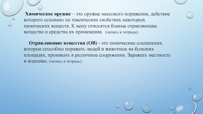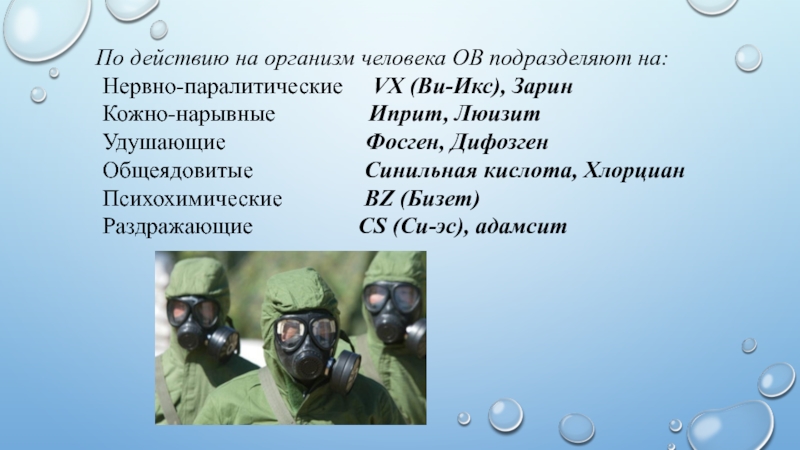 Химическое оружие – это прежде всего газообразные вещества, которые воздействуют через органы дыхания.