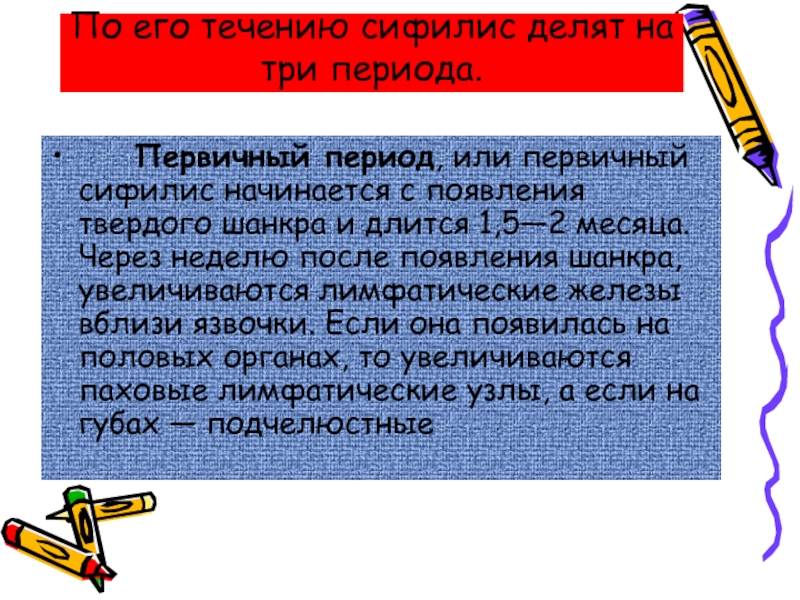 Первичный период, или первичный сифилис начинается с появления твердого шанкра и длится 1,5—2 месяца. Через неделю после появления шанкра, увеличиваются лимфатические железы вблизи язвочки. Если она появилась на половых органах, то увеличиваются паховые лимфатические узлы, а если на губах — подчелюстные