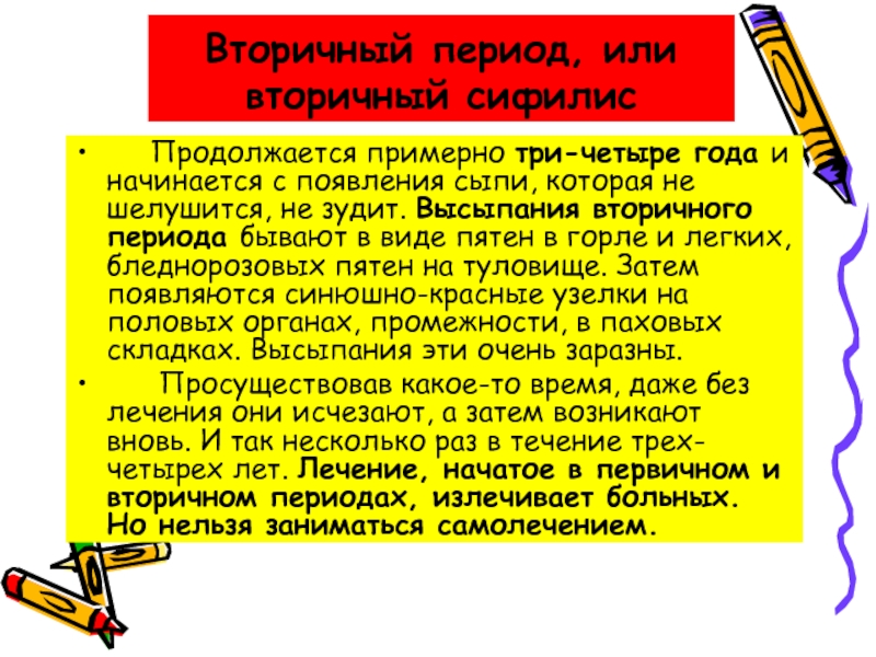 Просуществовав какое-то время, даже без лечения они исчезают, а затем возникают вновь. И так несколько раз в течение трех-четырех лет. Лечение, начатое в первичном и вторичном периодах, излечивает больных. Но нельзя заниматься самолечением.