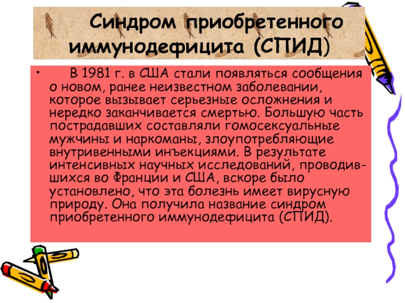 в США стали появляться сообщения о новом, ранее неизвестном заболевании, которое вызывает серьезные осложнения и нередко заканчивается смертью. Большую часть пострадавших составляли гомосексуальные мужчины и наркоманы, злоупотребляющие внутривенными инъекциями. В результате интенсивных научных исследований, проводив-шихся во Франции и США, вскоре было установлено, что эта болезнь имеет вирусную природу. Она получила название синдром приобретенного иммунодефицита (СПИД).