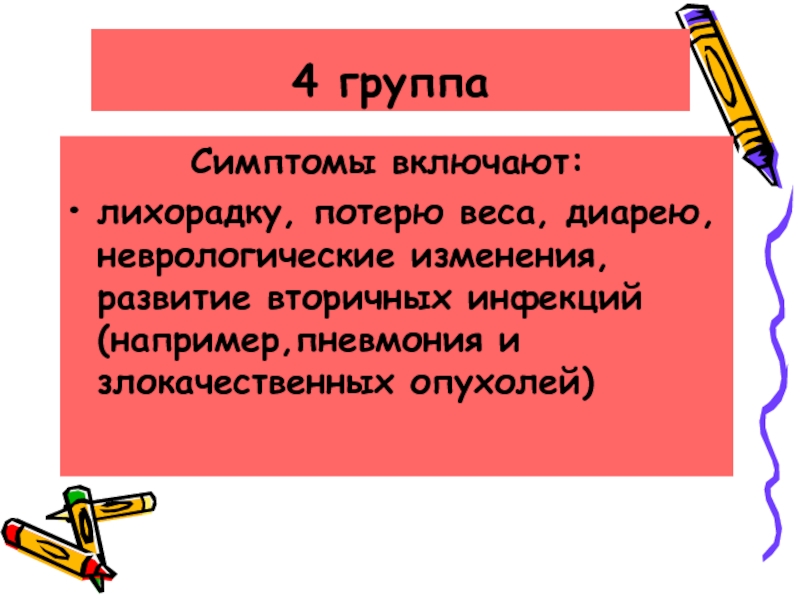 неврологические изменения, развитие вторичных инфекций (например,пневмония и злокачественных опухолей)