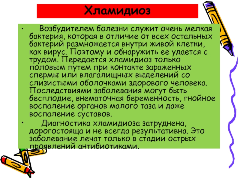 отличие от всех остальных бактерий размножается внутри живой клетки, как вирус. Поэтому и обнаружить ее удается с трудом. Передается хламидиоз только половым путем при контакте зараженных спермы или влагалищных выделений со слизистыми оболочками здорового человека. Последствиями заболевания могут быть бесплодие, внематочная беременность, гнойное воспаление органов малого таза и даже воспаление суставов.