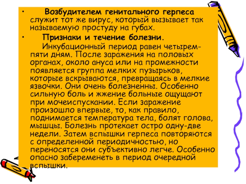 Инкубационный период равен четырем-пяти дням. После заражения на половых органах, около ануса или на промежности появляется группа мелких пузырьков, которые вскрываются, превращаясь в мелкие язвочки. Они очень болезненны. Особенно сильную боль и жжение больные ощущают при мочеиспускании. Если заражение произошло впервые, то, как правило, поднимается температура тела, болят голова, мышцы. Болезнь протекает остро одну-две недели. Затем вспышки герпеса повторяются с определенной периодичностью, но переносятся они субъективно легче. Особенно опасно забеременеть в период очередной вспышки.