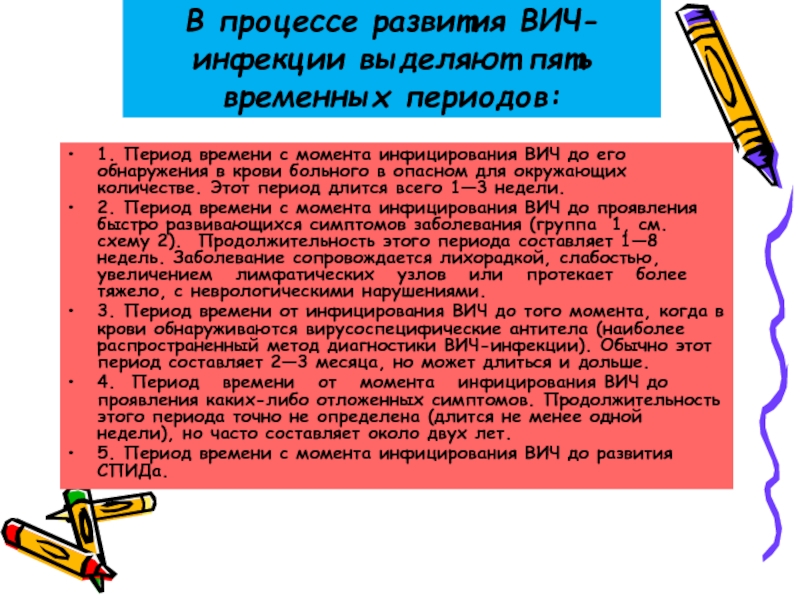 Слайд 19В процессе развития ВИЧ-инфекции выделяют пять временных периодов: