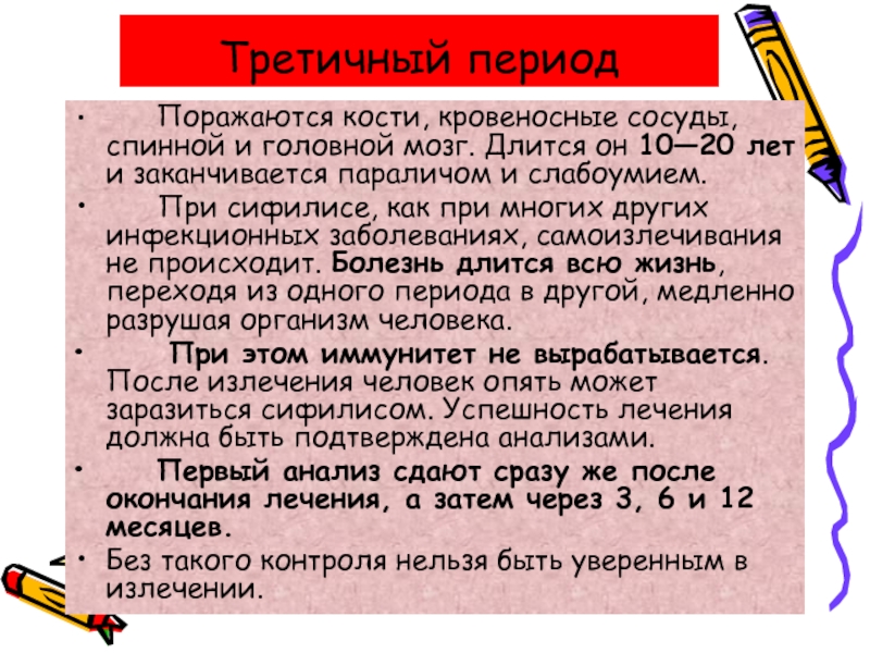 и головной мозг. Длится он 10—20 лет и заканчивается параличом и слабоумием.