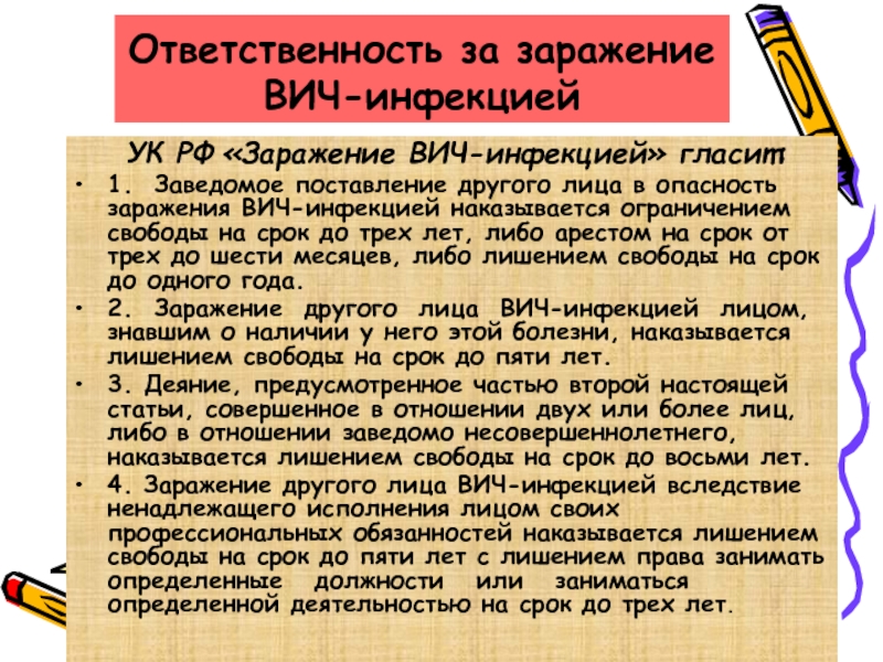 Слайд 22Ответственность за заражение ВИЧ-инфекцией