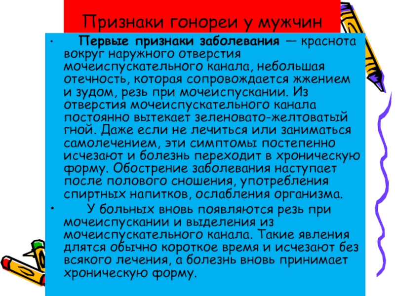 краснота вокруг наружного отверстия мочеиспускательного канала, небольшая отечность, которая сопровождается жжением и зудом, резь при мочеиспускании. Из отверстия мочеиспускательного канала постоянно вытекает зеленовато-желтоватый гной. Даже если не лечиться или заниматься самолечением, эти симптомы постепенно исчезают и болезнь переходит в хроническую форму. Обострение заболевания наступает после полового сношения, употребления спиртных напитков, ослабления организма.