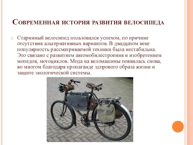 Современная история развития велосипедаСтаринный велосипед пользовался успехом, по причине отсутствия альтернативных вариантов. В двадцатом веке популярность рассматриваемой