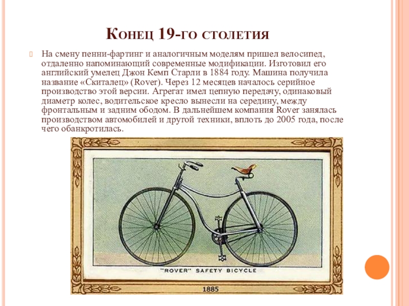 Конец 19-го столетияНа смену пенни-фартинг и аналогичным моделям пришел велосипед, отдаленно напоминающий современные модификации. Изготовил его английский