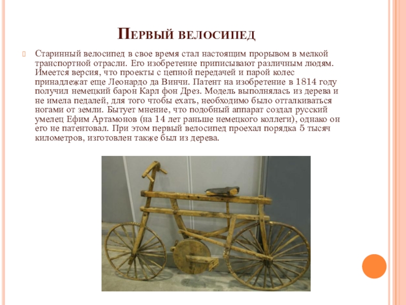 транспортной отрасли. Его изобретение приписывают различным людям. Имеется версия, что проекты с цепной передачей и парой колес принадлежат еще Леонардо да Винчи. Патент на изобретение в 1814 году получил немецкий барон Карл фон Дрез. Модель выполнялась из дерева и не имела педалей, для того чтобы ехать, необходимо было отталкиваться ногами от земли. Бытует мнение, что подобный аппарат создал русский умелец Ефим Артамонов (на 14 лет раньше немецкого коллеги), однако он его не патентовал. При этом первый велосипед проехал порядка 5 тысяч километров, изготовлен также был из дерева.
