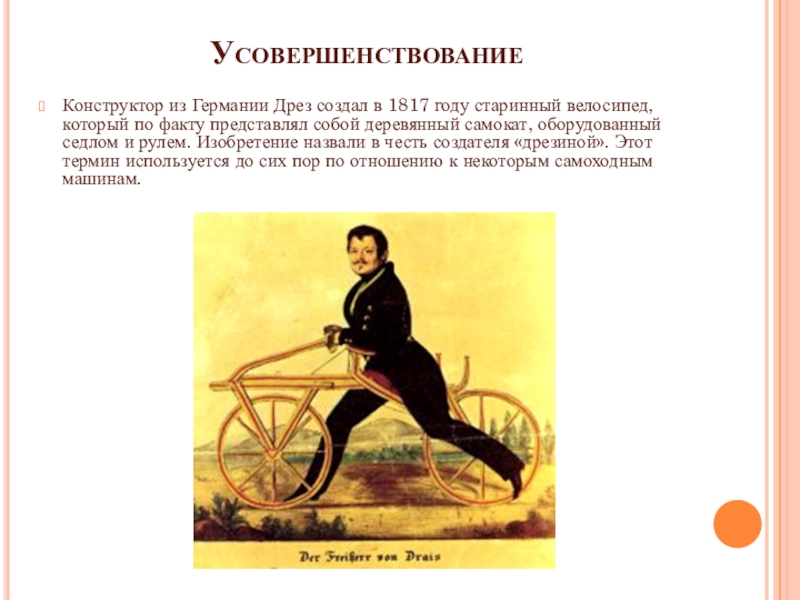 УсовершенствованиеКонструктор из Германии Дрез создал в 1817 году старинный велосипед, который по факту представлял собой деревянный самокат,