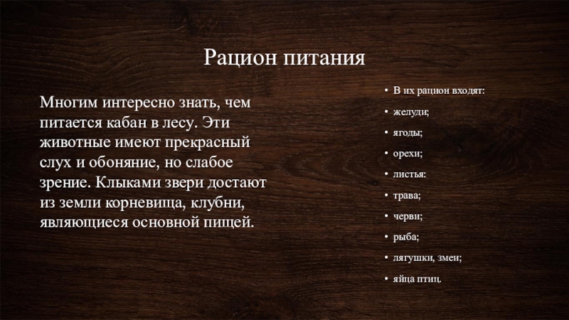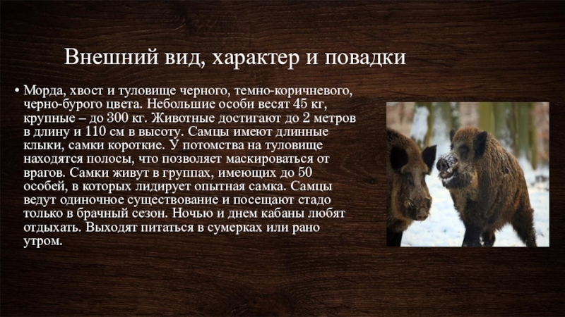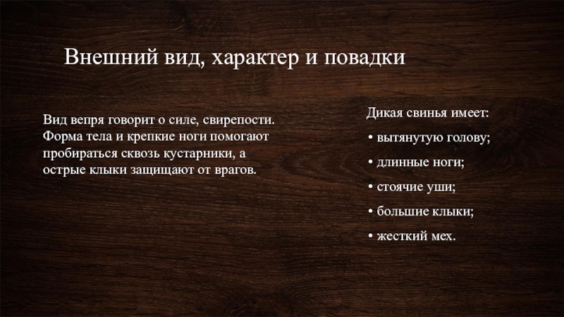 Вид вепря говорит о силе, свирепости. Форма тела и крепкие ноги помогают пробираться сквозь кустарники, а острые клыки защищают от врагов.