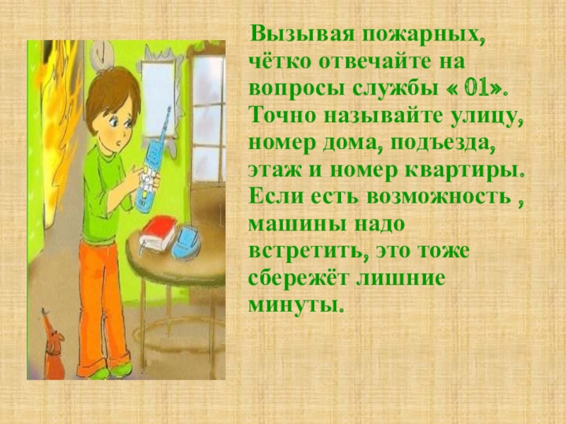 Слайд 5 Вызывая пожарных, чётко отвечайте на вопросы службы « 01».