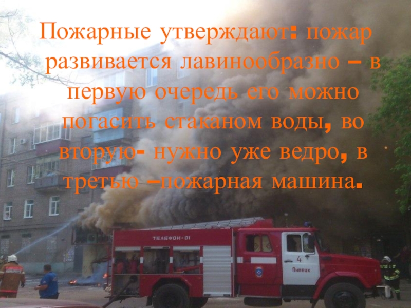 Слайд 4Пожарные утверждают: пожар развивается лавинообразно – в первую очередь его можно