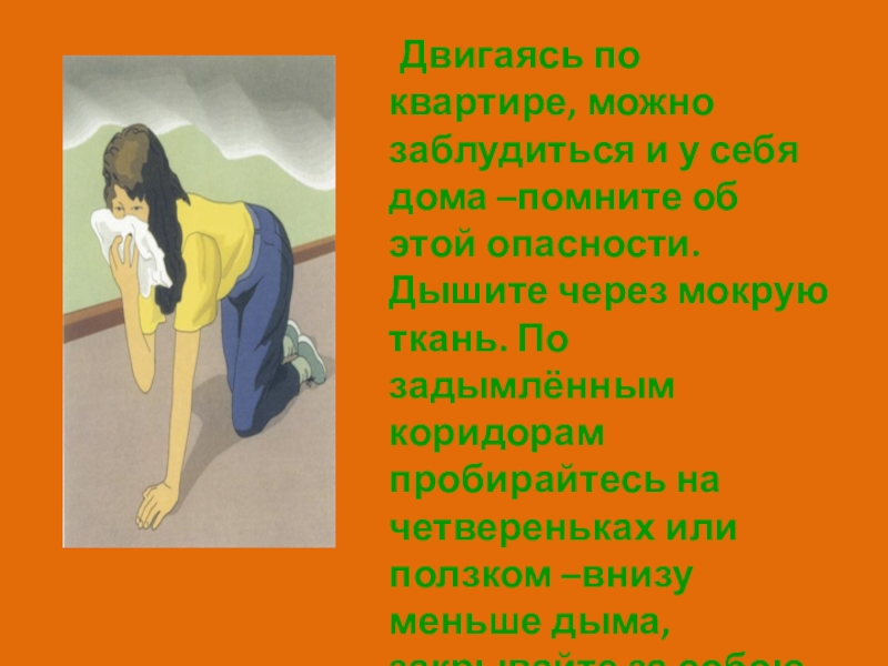 дома –помните об этой опасности. Дышите через мокрую ткань. По задымлённым коридорам пробирайтесь на четвереньках или ползком –внизу меньше дыма, закрывайте за собою двери.