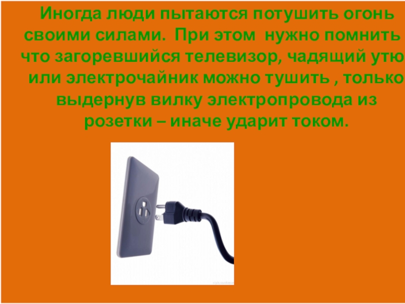 нужно помнить , что загоревшийся телевизор, чадящий утюг или электрочайник можно тушить , только выдернув вилку электропровода из розетки – иначе ударит током.