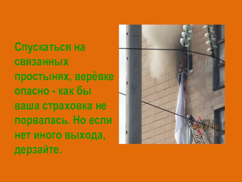 Слайд 15Спускаться на связанных простынях, верёвке опасно - как бы ваша страховка