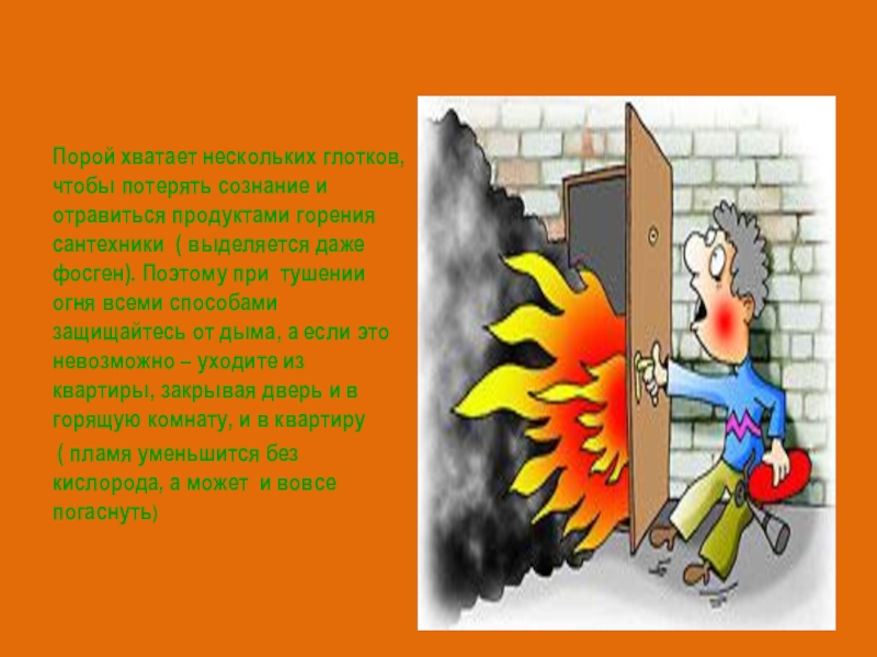 сантехники ( выделяется даже фосген). Поэтому при тушении огня всеми способами защищайтесь от дыма, а если это невозможно – уходите из квартиры, закрывая дверь и в горящую комнату, и в квартиру