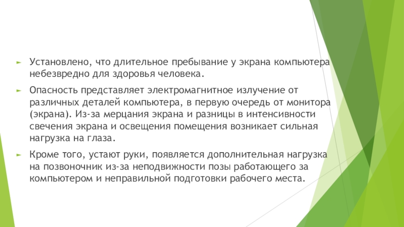 Слайд 3Установлено, что длительное пребывание у экрана компьютера небезвредно для здоровья человека.