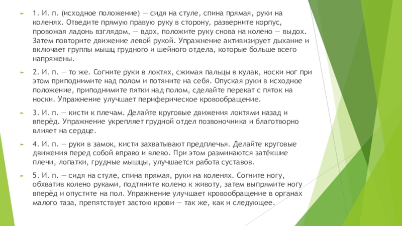 1. И. п. (исходное положение) — сидя на стуле, спина прямая, руки на коленях. Отведите прямую правую