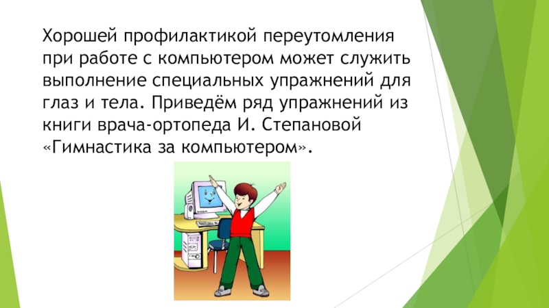 Слайд 5Хорошей профилактикой переутомления при работе с компьютером может служить выполнение специальных