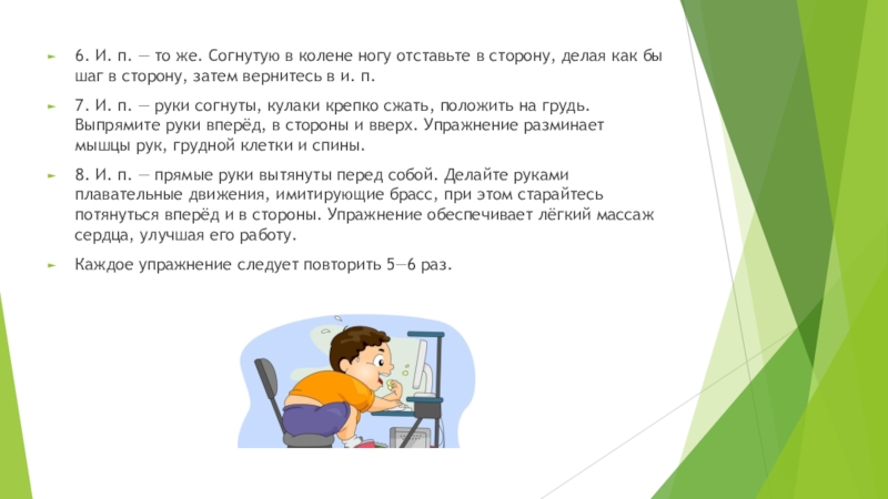 8. И. п. — прямые руки вытянуты перед собой. Делайте руками плавательные движения, имитирующие брасс, при этом старайтесь потянуться вперёд и в стороны. Упражнение обеспечивает лёгкий массаж сердца, улучшая его работу.