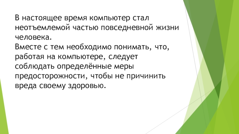 В настоящее время компьютер стал неотъемлемой частью повседневной жизни человека. Вместе с тем необходимо понимать, что, работая на компьютере, следует соблюдать определённые меры предосторожности, чтобы не причинить вреда своему здоровью.