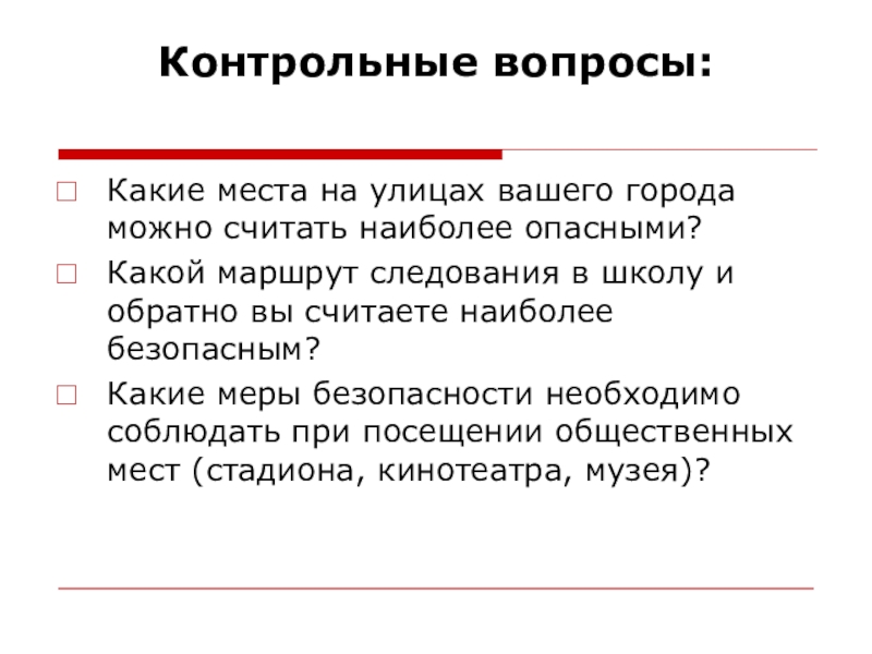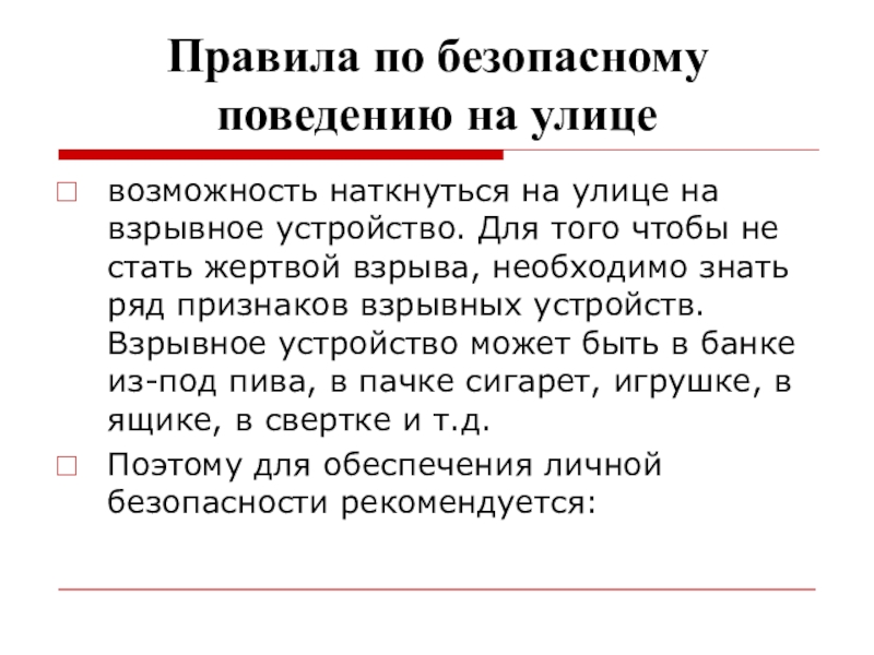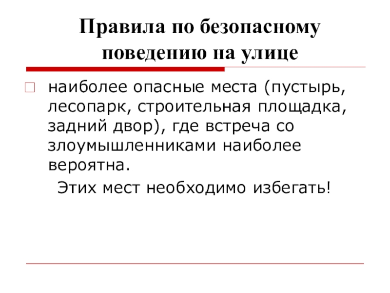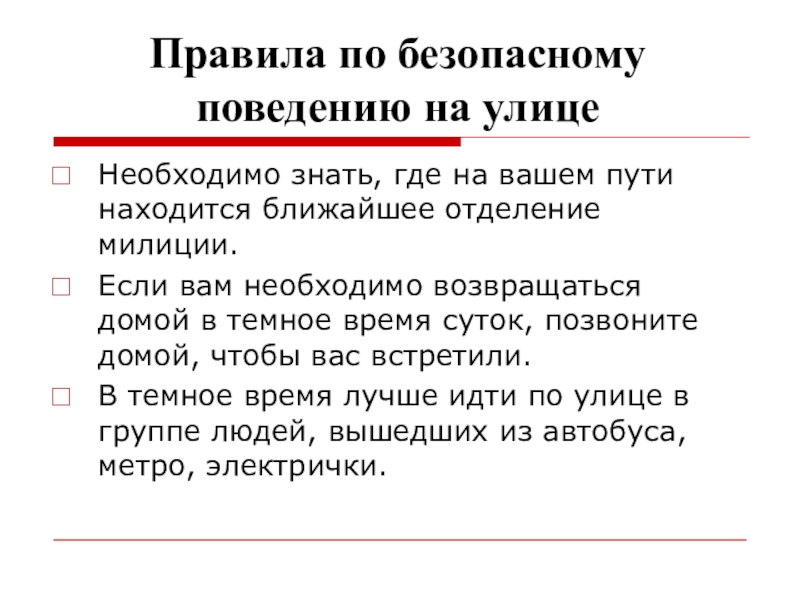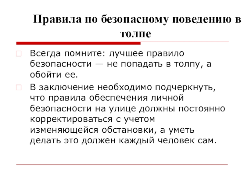 В заключение необходимо подчеркнуть, что правила обеспечения личной безопасности на улице должны постоянно корректироваться с учетом изменяющейся обстановки, а уметь делать это должен каждый человек сам.