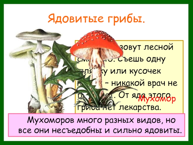 Мухоморов много разных видов, но все они несъедобны и сильно ядовиты.